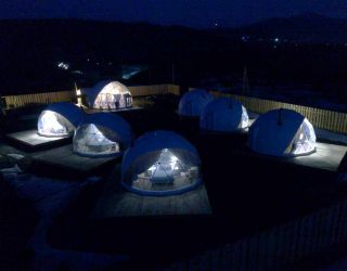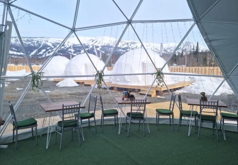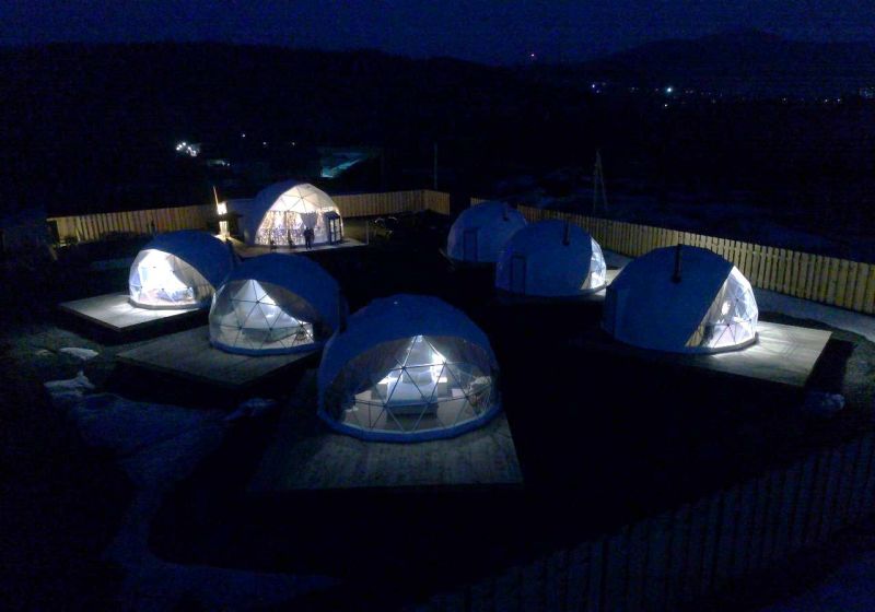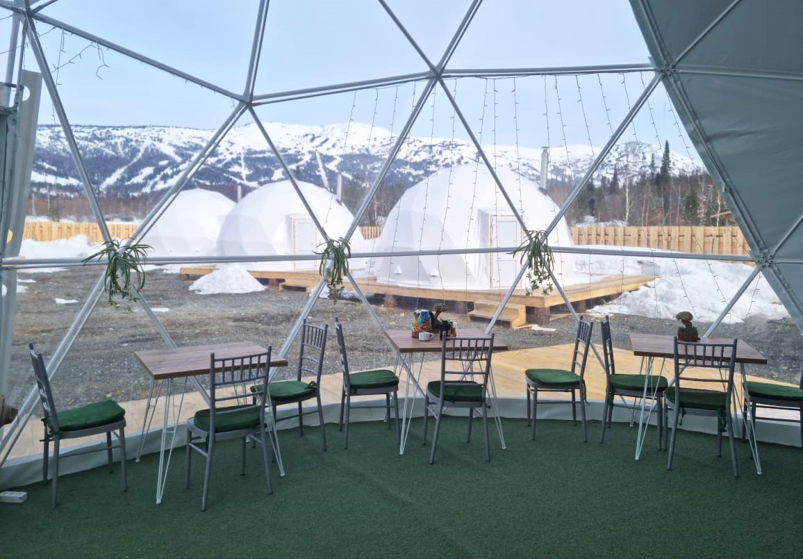 Глэмпинг разместился в сибирском поселке Шерегеш, известном своим горнолыжном комплексом. Здесь хорошо развита инфраструктура – магазины кафе, банные комплексы, горнолыжные подъемники, пункты проката, работают инструкторы. В двух часах езды – Новокузнецк, аэропорт и крупный железнодорожный вокзал.
